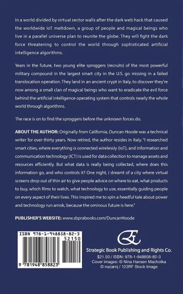 In a world divided by virtual sector walls after the dark web hack that caused the worldwide IoT meltdown, a group of people and magical beings who live in a parallel universe plan to reunite the globe. They will fight the dark force threatening to control the world through sophisticated artificial intelligence algorithms. Years in the future, two young elite sproggers (recruits) of the most powerful military compound in the largest smart city in the U.S. go missing in a failed translocation operation. They land in an ancient crypt in Italy, to discover they're now among a small clan of magical beings who want to eradicate the evil force behind the artificial intelligence operating system that controls nearly the whole world through algorithms. The race is on to find the sproggers before the unknown forces do. About the Author: Originally from California, Duncan Hoode was a technical writer for over thirty years. Now retired, the author resides in Italy. "I researched smart cities, where everything is connected wirelessly (IoT), and information and communication technology (ICT) is used for data collection to manage assets and resources efficiently. But what data is really being collected, where does this information go, and who controls it? One night, I dreamt of a city where virtual screens drop out of thin air to give people advice on where to eat, what products to buy, which films to watch, what technology to use, essentially guiding people on every aspect of their lives. This inspired me to spin a heedful tale about power and technology run amok, because the ominous future is here."