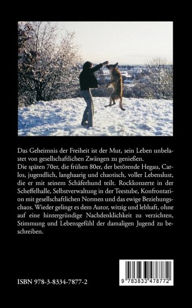 Carlos ist jung, langhaarig, chaotisch und er lebt in den 70ern im betörenden Hegau. Schäferhund ist sein bester Freund und Gesprächspartner, immer ein wenig klüger als ein Mensch. Eine Geschichte voller Lebenslust, das pulsierende Leben einer Jugend im Aufbruch, wilde Rockkonzerte in der alten Scheffelhalle,Hegauer Szene Kneipenleben, Arbeitseinsätze in den Mannheimer Kasernen und immer wieder die Liebe und das Verlangen, alles beginnt normal,endet aber stets im völligen Chaos. Stimmung und Lebensgefühl der damaligen Jugend sind witzig und lebhaft und doch mit einer gewissen Nachdenklichkeit beschrieben.