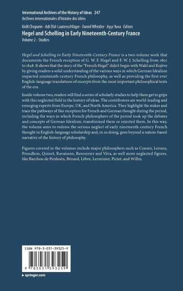 Hegel and Schelling in Early Nineteenth-Century France is a two-volume work that documents the French reception of G. W. F. Hegel and F. W. J. Schelling from 1801 to 1848. It shows that the story of the "French Hegel" didn't begin with Wahl and Kojève by giving readers a solid understanding of the various ways in which German Idealism impacted nineteenth-century French philosophy, as well as providing the first ever English-language translations of excerpts from the most important philosophical texts of the era.