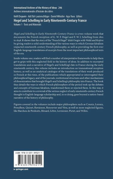 Inside volume one, readers will find a number of interpretative frameworks to help them get to grips with this neglected field in the history of ideas. In addition to excerpted translations and a narrative of Hegel's and Schelling's fate in France during the early nineteenth century, this volume includes an introduction on transnational reception history, as well as an analytical catalogue of the translations of their work produced in French at this time, of thepublications which appropriated or interrogated their philosophical legacy, and of the journals, institutional structures and other mechanisms of dissemination that brought Hegel's and Schelling's philosophy into France. The book thus details the ways in which French philosophers of the period took up the debates and concepts of German Idealism, transformed them or rejected them. In this way, it aims to contribute to a reversal of the serious neglect of early nineteenth-century French thought in English-language scholarship and, in so doing, goes beyond a nation-based narrative of the history of philosophy.