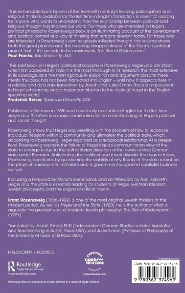 'The best book on Hegel's political philosophy is Franz Rosenzweig's Hegel und der Staat, which first appeared in 1920. It is the most thorough in its research, the most extensive in its coverage, and the most rigorous in exposition and argument. Despite these merits, the book has not been translated into English-until now. It appears here in a reliable and accurate translation by Josiah and Jules Simon. This is a major event in Hegel scholarship, and a major contribution to the study of Hegel in the English-speaking world.' - Frederick Beiser, Syracuse University, USA