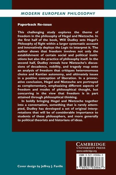 This study explores the theme of freedom in the philosophy of Hegel and Nietzsche. In bringing Hegel and Nietzsche together into a conversation, Will Dudley has developed some original interpretations that will be of considerable importance to students of these philosophers, and to political theorists and historians of ideas.