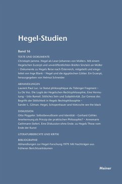 Die Hegel-Studien dokumentieren seit 1961 die neuen Ansätze und Ergebnisse auf allen Gebieten der internationalen Hegel-Forschung. Zusätzlich sind die Hegel-Studien seit 2013 auch für andere Autoren und Debatten der Klassischen Deutschen Philosophie offen und bieten stärker systematisch orientierten Beiträgen ein Forum, soweit dies einen signifikanten Gewinn für die Auseinandersetzung mit der Epoche um 1800 und einen Bezug auf gegenwärtige Diskussionen verspricht. Band 16: TEXTE UND DOKUMENTE Christoph Jamme. Hegel als Leser Johannes von Müllers. Mit einem Hegelschen Exzerpt und unveröffentlichten Briefen Sinclairs an Müller ¿ Dokumente zu Hegels Reise nach Österreich, mitgeteilt und eingeleitet von Inge Blank ¿ Hegel und die ägyptischen Götter. Ein Exzerpt, herausgegeben von Helmut Schneider ABHANDLUNGEN Laurent Paul Luc. Le Statut philosophique du Tübinger Fragment ¿ Lu De Vos. Die Logik der Hegelschen Rechtsphilosophie; Eine Vermutung ¿ Udo Rameil. Sittliches Sein und Subjektivität. Zur Genese des Begriffs der Sittlichkeit in Hegels Rechtsphilosophie ¿ Sander L. Gilman. Hegel, Schopenhauer and Nietzsche see the black DISKUSSION Otto Pöggeler. Selbstbewußtsein und Identität ¿ Gerhard Göhler. Anerkennung als Prinzip der praktischen Philosophie? ¿ Annemarie Gethmann-Siefert. Eine Diskussion ohne Ende: zu Hegels These vom Ende der Kunst LITERATURBERICHTE UND KRITIK BIBLIOGRAPHIE Abhandlungen zur Hegel-Forschung 1979. Mit Nachträgen aus früheren Berichtszeiträumen Print-On-Demand-Nachdruck der Ausgabe von 1981.