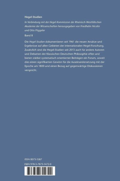 Die Hegel-Studien dokumentieren seit 1961 die neuen Ansätze und Ergebnisse auf allen Gebieten der internationalen Hegel-Forschung. Zusätzlich sind die Hegel-Studien seit 2013 auch für andere Autoren und Debatten der Klassischen Deutschen Philosophie offen und bieten stärker systematisch orientierten Beiträgen ein Forum, soweit dies einen signifikanten Gewinn für die Auseinandersetzung mit der Epoche um 1800 und einen Bezug auf gegenwärtige Diskussionen verspricht. Band 8: TEXTE UND DOKUMENTE Otto Pöggeler. Sinclair ¿ Hölderlin ¿ Hegel. Ein Brief von Karl Rosenkranz an Christoph Th. Schwab ¿ Helmut Schneider. Zur Dreiecks-Symbolik bei Hegel ¿ Manfred Baum und Kurt Meist. Hegels »Prometheische Confession«. Quellen für vier Jenaer Aphorismen Hegels ABHANDLUNGEN José María Ripalda. Poesie und Politik beim frühen Hegel ¿ Klaus Düsing. Die Bedeutung des antiken Skeptizismus für Hegels Kritik der sinnlichen Gewißheit ¿ George DiGiovanni. Montreal. Reflection and Contradiction. A Commentary on some Passages of Hegel¿s Science of Logic ¿ Hans-Martin Sass. Die philosophische Erdkunde des Hegelianers Ernst Kapp. Ein Beitrag zur Wissenschaftstheorie und Fortschrittsdiskussion in der Hegelschule LITERATURBERICHTE UND KRITIK BIBLIOGRAPHIE Abhandlungen zur Hegel-Forschung 1971 Print-On-Demand-Nachdruck der Ausgabe von 1973.