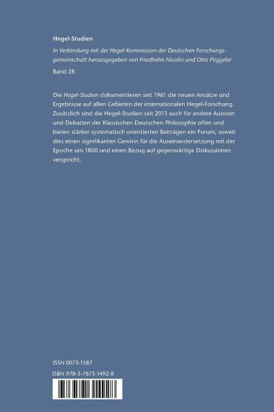 Die Hegel-Studien wurden 1961 in Verbindung mit der Hegel-Kommission der Deutschen Forschungsgemeinschaft begründet und entstanden im engen Zusammenhang mit der Arbeit an der historisch-kritischen Gesamtausgabe 'Georg Wilhelm Friedrich Hegel, Gesammelte Werke'. Herausgeber waren bis einschließlich Band 35 (2000) Friedhelm Nicolin und Otto Pöggeler. 1999 wurde der Verlagswechsel zum Felix Meiner Verlag vollzogen. Otto Pöggeler. Fünfundzwanzig Jahre Hegel-Archiv der Ruhr-Universität Bochum I. Friedrich Hogemann und Helmut Schneider. Verzeichnis der Heidelberger Schriften Hegels ¿ Friedhelm Nicolin. Hegels Korrespondenz und amtlicher Schriftwechsel. Vorüberlegungen zur historisch-kritischen Edition II. Andreas Grossmann. Orte Hegels und Hegels Ort. Bemerkungen zur »Topographie« des Idealismus ¿ Manfred Baum. Metaphysischer Monismus bei Hölderlin und Hegel ¿ Klaus Düsing. Hegels »Phänomenologie« und die idealistische Geschichte des Selbstbewußtseins ¿ Dietmar Köhler. Hegels Gewissensdialektik ¿ Wolfgang Bonsiepen. Bedeutung und Grenzen der hermeneutischen Hegel-Interpretation. Bemerkungen zu Kaehler/Marx: Die Vernunft in Hegels Phänomenologie des Geistes ¿ Udo Rameil. Der teleologische Übergang zur Ideenlehre und die Entstehung des Kapitels »Objektivität« in Hegels propädeutischer Logik ¿ Elisabeth Weisser-Lohmann. »Divide et impera«. Zu Hegels Heidelberger Stände- und Verfassungslehre ¿ Annemarie Gethmann-Siefert. Hegel über Kunst und Alltäglichkeit. Zur Rehabilitierung der schönen Kunst und des ästhetischen Genusses ¿ Christoph Jamme. Hegel als Rezensent ¿ Rolf-Peter Horstmann. Metaphysikkritik bei Hegel und Nietzsche ¿ Heinz Kimmerle. Hegel und Afrika: Das Glas zerspringt III. Otto Pöggeler. Hölderlin, Schelling und Hegel bei Heidegger
