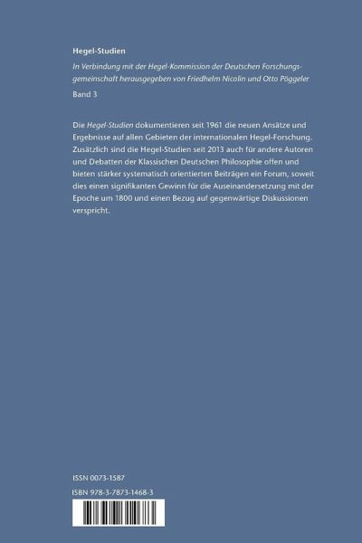 Die Hegel-Studien wurden 1961 in Verbindung mit der Hegel-Kommission der Deutschen Forschungsgemeinschaft begründet und entstanden im engen Zusammenhang mit der Arbeit an der historisch-kritischen Gesamtausgabe 'Georg Wilhelm Friedrich Hegel, Gesammelte Werke'. Herausgeber waren bis einschließlich Band 35 (2000) Friedhelm Nicolin und Otto Pöggeler. 1999 wurde der Verlagswechsel zum Felix Meiner Verlag vollzogen. TEXTE UND DOKUMENTE Hegels propädeutische Logik für die Unterklasse des Gymnasiums. Herausgegeben und besprochen von Friedhelm Nicolin ¿ Dieter Henrich. Leutwein über Hegel. Ein Dokument zu Hegels Biographie ¿ Günther Nicolin. Verlorenes aus Hegels Briefwechsel ABHANDLUNGEN Hartmut Buchner. Hegel und das Kritische Journal der Philosophie ¿ Reiner Wiehl. Platos Ontologie in Hegels Logik des Seins ¿ Eugène J. Fleischmann. Hegels Umgestaltung der Kantischen Logik ¿ Josef Derbolav. Hegels Theorie der Handlung ¿ Paul Chamley. Les origines de la pensée économique de Hegel BERICHTE Josef Gauvin. Le sens et son phénomène. Projet d¿un Lexique de la Phénoménologie de l¿Esprit ¿ Dieter Henrich¿/¿J. L. Döderlein. Carl Immanuel Diez. Ankündigung einer Ausgabe seiner Schriften und Briefe ¿ Josef Zumr. Hegel und die Slawen. Bericht über eine Warschauer Tagung ¿ Enzo Tota. Das Verhältnis Hegel-Marx. Eine Diskussion marxistischer Philosophen in Italien LITERATURBERICHTE UND KRITIK BIBLIOGRAPHIE Abhandlungen zur Hegel-Forschung 1962/63