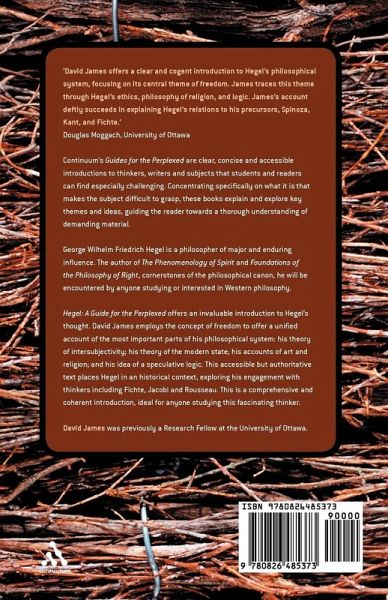 Continuum's Guides for the Perplexed are clear, concise and accessible introductions to thinkers, writers and subjects that students and readers can find especially challenging. Concentrating specifically on what it is that makes the subject difficult to fathom, these books explain and explore key themes and ideas, guiding the reader towards a thorough understanding of demanding material. George Wilhelm Friedrich Hegel is a philosopher of major and enduring influence. The author of The Phenomenology of Spirit and Foundations of the Philosophy of Right, cornerstones of the philosophical canon, he will be encountered by anyone studying or interested in Western philosophy. Hegel: A Guide for the Perplexed offers an invaluable introduction to Hegel's thought. David James employs the concept of freedom to offer a unified account of the most important parts of his philosophical system: his theory of intersubjectivity; his theory of the modern state; his accounts of art and religion; and his idea of a speculative logic. This accessible but authoritative text places Hegel in an historical context, exploring his engagement with thinkers including Fichte, Jacobi and Rousseau. This is a comprehensive and coherent introduction, ideal for anyone studying this fascinating thinker.