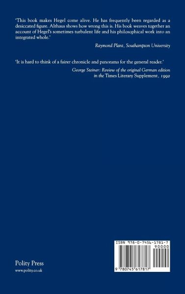 This accessible and highly readable book is the first full-length biography of Hegel to be published since the largely outdated treatments of the nineteenth century. Althaus draws on new historical material and scholarly sources about the life and times of this most enigmatic and influential of modern philosophers. He paints a living portrait of a thinker whose personality was more complex than is often imagined, and shows that Hegel's relation to his revolutionary times was also more ambiguous than is usually accepted. Althaus presents a broad chronological narrative of Hegel's development from his early theological studies in Tübingen and the associated unpublished writings, profoundly critical of the established religious orthodoxies. He traces Hegel's years of philosophical apprenticeship with Schelling in Jena as he struggled for an independent intellectual position, up to the crowning period of influence and success in Berlin where Hegel appeared as the advocate of the modern Prussian state. Althaus tells a vivid story of Hegel's life and his intellectual and personal crises, drawing generously on the philosopher's own words from his extensive correspondence. His central role in the cultural and political life of the time is illuminated by the impressions and responses of his contemporaries, such as Schelling, Schleiermacher and Goethe. This panoramic introduction to Hegel's life, work and times will be a valuable resource for scholars, students and anyone interested in this towering figure of philosophy.