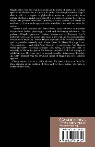 Hegel's philosophy has often been compared to a circle of circles: an ascending spiral to its admirers, but a vortex to its critics. The metaphor reflects Hegel's claim to offer a conception of philosophical reason so comprehensive as to include all others as partial forms of itself. It is a claim which faces the writer on Hegel with peculiar difficulties. Criticism, it would appear, can always be outflanked; criticism of the system can be turned back into criticism within the system. Michael Rosen discusses the philosophical issues involved in historical interpretation before presenting a novel and challenging solution to the problem of Hegel's openness to criticism. Contrary to received opinion, Hegel's philosophy does not, he argues, draw upon a universal and pre-suppositionless conception of rationality. Rather, Hegel's originality lies in founding his system upon a particular, avowedly mystical conception of philosophical experience. This experience - Hegel calls it 'pure Thought' - is fundamental. Pure Thought makes speculative reasoning intelligible and, hence, underpins the claim to rationality of the entire system. Dr Rosen's conclusion is that all attempts at rehabilitation of Hegel are based on misunderstanding. When restored to their speculative-mystical shell the irrational kernel of Hegel's concepts becomes apparent.
