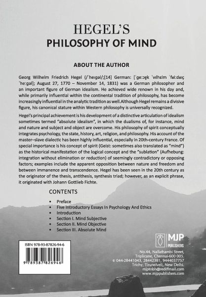 Five Introductory Essays In Psychology And Ethics, Introduction, Section I. Mind Subjective, Section II. Mind Objective, Section III. Absolute Mind. I here offer a translation of the third or last part of Hegel's encyclopaedicsketch of philosophy,-the Philosophy of Mind. The volume, like its subject, stands complete in itself. But it may also be regarded as asupplement or continuation of the work begun in my version of his Logic. I have not ventured upon the Philosophy of Nature which lies between these two. That is a province, to penetrate into which would require an equipment of learning I make no claim to,-a province, also, of which the present-day interest would be largely historical, or at least bound up with historical circumstances.The translation is made from the German text given in the Second Part of the Seventh Volume of Hegel's Collected Works, occasionally corrected by comparison with that found in the second and third editions (of 1827 and 1830) published by the author. I have reproduced onlyHegel's own paragraphs, and entirely omitted the Zusätze of the editors. These addenda-which are in origin lecture-notes-to the paragraphs are, in the text of the Collected Works, given for the first section only. The psychological part which they accompany has been barely treated elsewhere by Hegel: but a good popular exposition of it will be found in Erdmann's Psychologische Briefe. The second section was dealt with at greater length by Hegel himself in his Philosophy of Law (1820). The topics of the third section are largely covered by his lectures on Art, Religion, and History of Philosophy.I do not conceal from myself that the text offers a hard nut to crack. Yet here and there, even through the medium of the translation, I think some light cannot fail to come to an earnest student. Occasionally, too, as, for instance, in §406, 459, 549, and still more in §552, 573, at the close of which might stand the words Liberavi animam meam, the writer really "lets himself go," and gives his mind freely on questions where speculation comes closely in touch with life.