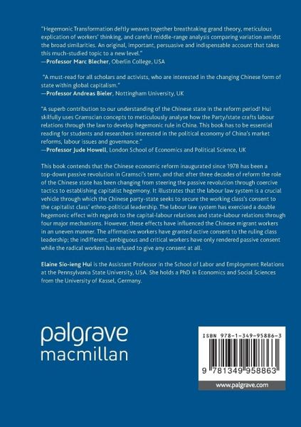 This book contends that the Chinese economic reform inaugurated since 1978 has been a top-down passive revolution, in Gramsci's term, and that after three decades of reform the role of the Chinese state has been changing from steering the passive revolution through coercive tactics to establishing capitalist hegemony. It illustrates that the labour law system is a crucial vehicle through which the Chinese party-state seeks to secure the working class's consent to the capitalist class's ethno-political leadership. The labour law system has exercised a double hegemonic effect with regards to the capital-labour relations and state-labour relations through four major mechanisms. However, these effects have influenced the Chinese migrant workers in an uneven manner. The affirmative workers have granted active consent to the ruling class leadership; the indifferent, ambiguous and critical workers have only rendered passive consent while the radical workers has refused to give any consentat all.