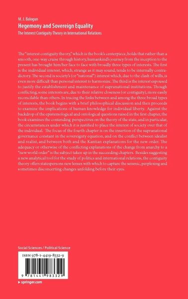The "interest contiguity theory," which is the book's centerpiece, holds that rather than a smooth, one-way cruise through history, humankind's journey from the inception to the present has brought him/her face to face with broadly three types of interests. The first is the individual interest, which, strange as it may sound, tends to be internally contradictory. The second is society's (or "national") interest which, due to the clash of wills, is even more difficult than personal interest to harmonize. The third is the interest espoused to justify the establishment and maintenance of supranational institutions. Though conflicting, some interests are, due to their relative closeness (or contiguity), more easily reconcilable than others.
