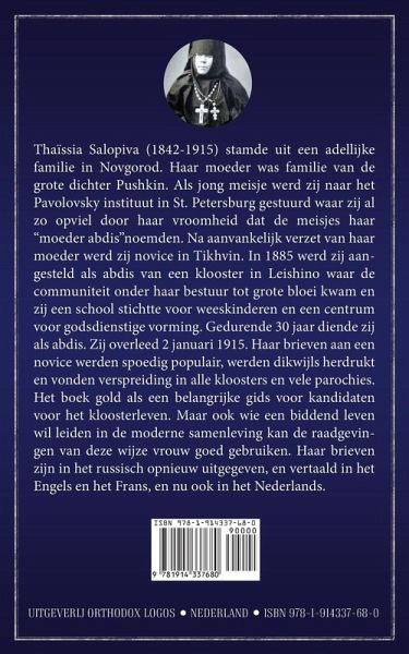 Thässia Salopiva (1842-1915) stamde uit een adellijkefamilie in Novgorod. Haar moeder was familie van de grote dichter Pushkin. Als jong meisje werd zij naar het Pavolovsky instituut in St. Petersburg gestuurd waar zij al zo opviel door haar vroomheid dat de meisjes haar "moeder abdis"noemden. Na aanvankelijk verzet van haar moeder werd zij novice in Tikhvin. In 1885 werd zij aangesteld als abdis van een klooster in Leishino waar de communiteit onder haar bestuur tot grote bloei kwam en zij een school stichtte voor weeskinderen en een centrum voor godsdienstige vorming. Gedurende 30 jaar diende zij als abdis. Zij overleed 2 januari 1915. Haar brieven aan een novice werden spoedig populair, werden dikwijls herdrukt en vonden verspreiding in alle kloosters en vele parochies. Het boek gold als een belangrijke gids voor kandidaten voor het kloosterleven. Maar ook wie een biddend leven wil leiden in de moderne samenleving kan de raadgevingen van deze wijze vrouw goed gebruiken. Haar brieven zijn in het russisch opnieuw uitgegeven, en vertaald in het Engels en het Frans, en nu ook in het Nederlands.