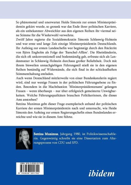 Bettina Munimus geht dieser Frage exemplarisch anhand der politischen Karriere der ersten Ministerpräsidentin Heide Simonis nach und untersucht, wie Heide Simonis den Aufstieg zur ersten Regierungschefin eines Bundeslandes erreichte und wie sie in diesem Amt führte.