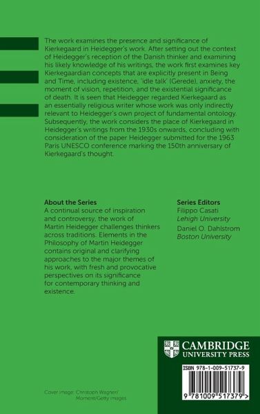 After setting out the context of Heidegger's reception of the Danish thinker and examining his likely knowledge of his writings, this Element examines key Kierkegaardian concepts that are explicitly present in Being and Time, including existence, 'idle talk' (Gerede), anxiety, the moment of vision, repetition, and the significance of death.