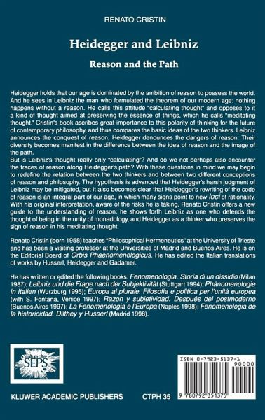 Heidegger holds that our age is dominated by the ambition of reason to possess the world. And he sees in Leibniz the man who formulated the theorem of our modern age: nothing happens without a reason. He calls this attitude `calculating thought' and opposes to it a kind of thought aimed at preserving the essence of things, which he calls `meditating thought'. Cristin's book ascribes great importance to this polarity of thinking for the future of contemporary philosophy, and thus compares the basic ideas of the two thinkers. Leibniz announces the conquest of reason; Heidegger denounces the dangers of reason. Their diversity becomes manifest in the difference between the idea of reason and the image of the path.