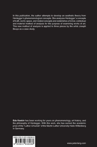 In this publication, the author attempts to develop an aesthetic theory from Heidegger's phenomenological concepts. She analyzes Heidegger`s concepts of truth, world, space, and related concepts and establishes a formal, contextual and material method of analysis for the purpose of examining works of art. This new method of analysis is applied to three pieces by the artist Joseph Beuys as a case study.