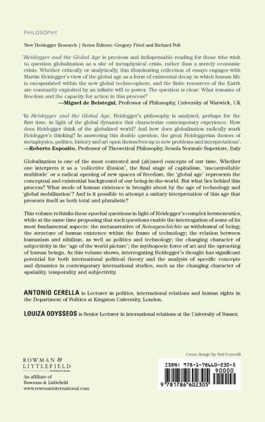 Introduction: De-framing the Global, Antonio Cerella and Louiza Odysseos / PART I. INSIDE THE GLOBAL: ENFRAMINGS / 1. Devastation, Michael Marder / 2. Transnational Islamist Militancy and Heidegger's Meditations on Technology, Nader El-Bizri / 3. Environmental (In)Action in the Age of the World Picture, Peter Lucas / 4. Heidegger and Zizek: On Political and Non-Political Action at the End of History, Michael Lewis / PART II. ACROSS THE GLOBAL: INFLUENCES / 5. Images of the World: Ontology and History in the Work of Foucault, Schmitt and Heidegger, Antonio Cerella / 6. Heidegger on Willpower and the Mood of Modernity, Erik Ringmar / 7. Who Is the Peasant Woman Who Trudges Through the Fields? Provincializing Eurocentric Artistic Space, Tina Chanter / 8. Heidegger's Hegel, The Christian Jew: 'Europe' as "Planetary Criminality and Machination", Laurence P. Hemming / PART III. OUTSIDE THE GLOBAL: CROSSINGS / 9. Thinking the Clearing in the Age of the Earth System: Heidegger and 'Cities like Forests', Henry Dicks /
