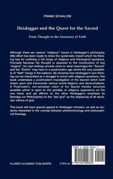 Although there are various `religious' traces in Heidegger's philosophy, little effort has been made to show the systematic import which his thinking has for outlining a full range of religious and theological questions. Precisely because his thought is opposed to the construction of any `dogma', his vast writings provide clues to what meaning(s) the `Sacred' and the `Divine' may have in a postmodern age where the very possibility of `faith' hangs in the balance. By showing how Heidegger's own thinking can be interpreted as a struggle to come to terms with religious questions, this book undertakes a postmodern investigation of the Sacred which both draws upon and transcends various world-religions and denominations. A postmodern, non-sectarian vision of the Sacred thereby becomes possible which is open to the plurality of religious experiences on the one hand, and yet affirms on the other Heidegger's emphasis (in Beiträge zur Philosophie) on the `last god' as the displacing of all sectarian visions of god.