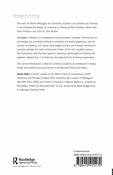This concise introduction is ideal for students of architecture in design studio at all levels; students of architecture pursuing undergraduate and postgraduate courses in architectural theory; academics and interested architectural practitioners. Heidegger for Architects is the second book in the new Thinkers for Architects series.