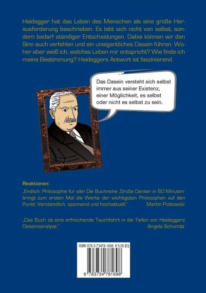 Heidegger ist zweifellos einer der bedeutendsten Denker des Abendlandes. Er selbst bezeichnete seine Philosophie als "Fundamentalontologie", da er die tiefsten Fundamente des menschlichen Weltverstehens aufzeigen wollte. Ihn interessiert über die Einzelwissenschaften hinausgehend der zu Grunde liegende Sinn des Lebens als Ganzes. Seine zentrale Frage lautet deshalb: "Was ist der Sinn von Sein?"Wenn wir aber nach dem Sinn von Sein und damit dem Sinn des Lebens fragen, müssen wir, so Heidegger, zu allererst erforschen, wer derjenige ist, der diese Frage stellt. Der Fragesteller ist der Mensch selbst, der als einziges Lebewesen auf der Welt diese Frage stellen kann und stellen muss. Der Mensch sucht ständig nach Orientierung. Deshalb beschreibt Heidegger das Leben des Menschen auch als eine große Herausforderung. Es lebt sich nicht von selbst, sondern bedarf ständiger Entscheidungen. Dabei können wir den Sinn unseres Lebens auch total verfehlen. Heidegger stellt die provokative These auf, dass die meisten Menschen in einem "uneigentlichen Modus" des Daseins leben. Er konfrontiert uns mit der Tatsache, dass wir in der Regel nur das tun, was 'man' eben so tut. 'Man' geht zur Schule, 'man' studiert, 'man' verdient möglichst viel Geld, 'man' macht Urlaub. Statt unser eigenes Leben zu verwirklichen, bewegen wir uns in den ausgetretenen Bahnen der anderen. Woher aber weiß ich, welches Leben mir entspricht? Wie finde ich meine Bestimmung?Das Buch "Heidegger in 60 Minuten" erklärt anhand der wichtigsten Zitate dessen berühmte "Daseinsanalyse" auf verständliche Weise. Es entführt den Leser auf eine abenteuerliche Reise zu den tiefsten Strukturen seiner Existenz. Es gibt wohl kaum jemanden, der bei der Lektüre der Kapitel über den "Sorgecharakter des Daseins" und der "Angst vor dem Nichts" nicht seine eigenen Lebenserfahrungen in die von Heidegger offen gelegten Strukturen hineinprojiziert und sich darin wiedererkennt. Im Kapitel "Was nutzt uns Heideggers Entdeckung heute?" wird dann die weitreichende und aktuelle Bedeutung seiner Gedanken für unser persönliches Leben und unsere Gesellschaft aufgezeigt.Das Buch ist in der beliebten Reihe "Große Denker in 60 Minuten" erschienen.