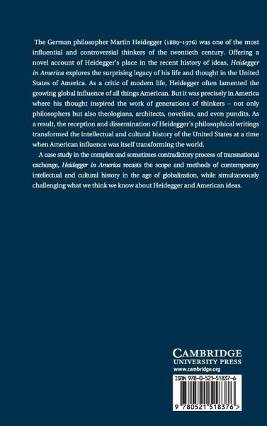Heidegger in America explores the surprising legacy of his life and thought in the United States of America. As a critic of modern life, Heidegger often lamented the growing global influence of all things American. However, it was precisely in America where his thought inspired the work of generations of thinkers - not only philosophers but also theologians, architects, novelists, and even pundits. As a result, the reception and dissemination of Heidegger's philosophical writings transformed the intellectual and cultural history of the United States at a time when American influence was itself transforming the world. A case study in the complex and sometimes contradictory process of transnational exchange, Heidegger in America recasts the scope and methods of contemporary intellectual and cultural history in the age of globalization, challenging what we think we know about Heidegger and American ideas simultaneously.