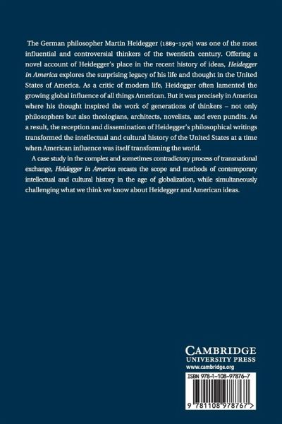 Heidegger in America is a case study in the recent history of transnational intellectual and cultural exchange. It suggests that the reception and dissemination of Heidegger's philosophical writings transformed the intellectual culture of the United States at a time when American influence was itself transforming the world.