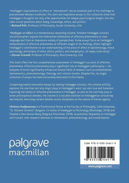 "This collection can be considered a major contribution to its own field, one that simultaneously invites further productive engagement with the theme from anyone interested in what Heidegger brings to bear on affects (be it from within the field or from without). The volume's efficacy lies in seriously considering how affects are existentially pertinent to human beings, deepening the widely-held intuition that they are. For that reason, it is of considerable merit and should be of interest to many." (Tijmen Lansdaal, Phenomenological Reviews, December 10, 2019)