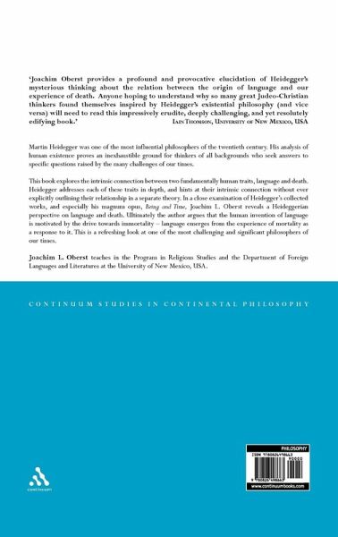 Martin Heidegger was one of the most influential philosophers of the 20th century. His analysis of human existence proves an inexhaustible ground for thinkers of all backgrounds who seek answers for their specific questions left open or opened up by our times. This book explores the intrinsic connection between two fundamentally human traits, language and death. Heidegger addresses each of these traits in depth, without ever explicitly outlining their relationship in a separate theory. However, in a close examination of Heidegger's magnum opus, Being and Time, Joachim L. Oberst uncovers a connection in three basic steps. Ultimately the author argues that the human invention of language is motivated by the drive towards immortality - language emerges from the experience of mortality as a response to it. This is a refreshing look at one of the most challenging and influential philosophers of our times.