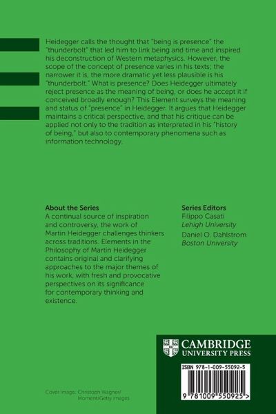 This study surveys the meaning and status of 'presence' in Heidegger. The author argues that he maintains a critical perspective, and that his critique can be applied not only to the tradition as interpreted in his 'history of being,' but also to contemporary phenomena such as information technology.
