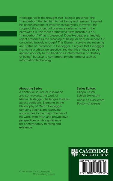 Heidegger calls the thought that 'being is presence' the 'thunderbolt' that led him to link being and time and inspired his deconstruction of Western metaphysics. However, the scope of the concept of presence varies in his texts; the narrower it is, the more dramatic yet less plausible is his 'thunderbolt.' What is presence? Does Heidegger ultimately reject presence as the meaning of being, or does he accept it if conceived broadly enough? This study surveys the meaning and status of 'presence' in Heidegger. It argues that Heidegger maintains a critical perspective, and that his critique can be applied not only to the tradition as interpreted in his 'history of being,' but also to contemporary phenomena such as information technology.