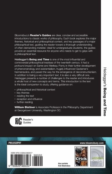 Continuum's Reader's Guides are clear, concise and accessible introductions to classic works of philosophy. Each book explores the major themes, historical and philosophical context and key passages of a major philosophical text, guiding the reader toward a thorough understanding of often demanding material. Ideal for undergraduate students, the guides provide an essential resource for anyone who needs to get to grips with a philosophical text. Heidegger's Being and Time is one of the most influential and controversial philosophical treatises of the 20th century. It had a profound impact on Sartre and Merleau-Ponty in their further development of phenomenology and existentialism, hugely influenced Gadamer's hermeneutics, and paved the way, partly directly and partly indirectly through Heidegger's later thought, for the emergence of deconstructionism. In addition to being a very important text, it is also a very difficult one. Heidegger presents a number of challenges to the the reader, asking them to abandon many assumptions fundamental to traditional philosophy, such as the mind/body distinction and the concept of substance. The text also introduces a whole host of new concepts and terms and as such is a hugely challenging, yet fascinating, piece of philosophical writing. In Heidegger's 'Being and Time': A Reader's Guide William Blattner explains the philosophical background against which the book was written and provides a clear and concise overview of the key themes and motifs. The book then examines this challenging text in details, guiding the reader to a clear understanding of Heidegger's work as a whole. Finally Blattner explores the reception and influence of the work and offers the student guidance on further reading. This is the ideal companion to study of this most influential and challenging of texts.