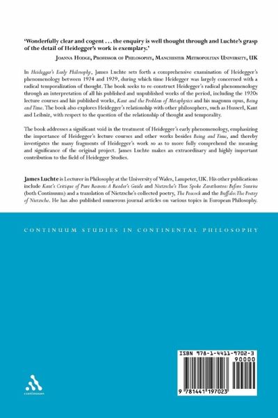 In Heidegger's Early Philosophy, James Luchte sets forth a comprehensive examination of Heidegger's phenomenology between 1924 and 1929, during which time Heidegger was largely concerned with a radical temporalization of thought. The book seeks to re-construct Heidegger's radical phenomenology through an interpretation of all his published and unpublished works of the period, including the 1920s lecture courses and his published works, Kant and the Problem of Metaphysics and his magnum opus, Being and Time. The book also explores Heidegger's relationship with other philosophers, such as Husserl, Kant and Leibniz, with respect to the question of the relationship of thought and temporality. The book addresses a significant void in the treatment of Heidegger's early phenomenology, emphasizing the importance of Heidegger's lecture courses and other works besides Being and Time, and thereby investigates the many fragments of Heidegger's work so as to more fully comprehend the meaning and significance of the original project. James Luchte makes an extraordinary and hugely important contribution to the field of Heidegger Studies.