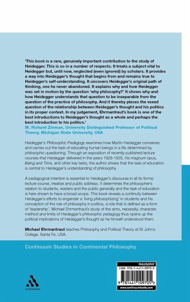Heidegger's Philosophic Pedagogy examines how Martin Heidegger conceives and carries out the task of educating human beings in a life determined by philosophic questioning. Through an exposition of recently published lecture courses that Heidegger delivered in the years 1928-1935, his magnum opus, Being and Time, and other key texts, the author shows that the task of education is central to Heidegger's understanding of philosophy. A pedagogical intention is essential to Heidegger's discourse in all its forms: lecture course, treatise and public address. It determines the philosopher's relation to students, readers and the public generally and the task of education is here shown to have a broad scope. This book reveals a continuity between Heidegger's efforts to engender a 'living philosophizing' in students and his conception of the role of philosophy in politics, a role that is defined as a form of 'leadership'. Michael Ehrmantraut's study of the aims, necessity, character, method and limits of Heidegger's philosophic pedagogy thus opens up the political implications of Heidegger's thought as he himself understood them.