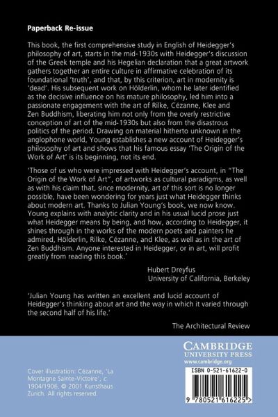 Drawing on material hitherto unknown in the anglophone world, Julian Young establishes a new account of Heidegger's philosophy of art and shows that his famous essay 'The Origin of the Work of Art' is its beginning, not its end.