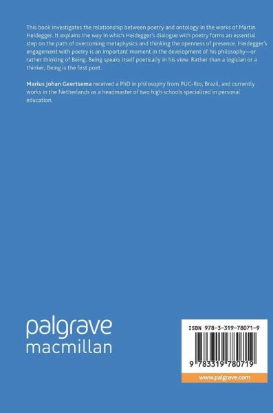 This book investigates the relationship between poetry and ontology in the works of Martin Heidegger. It explains the way in which Heidegger's dialogue with poetry forms an essential step on the path of overcoming metaphysics and thinking the openness of presence. Heidegger's engagement with poetry is an important moment in the development of his philosophy-or rather thinking of Being. Being speaks itself poetically in his view. Rather than a logician or a thinker, Being is the first poet.