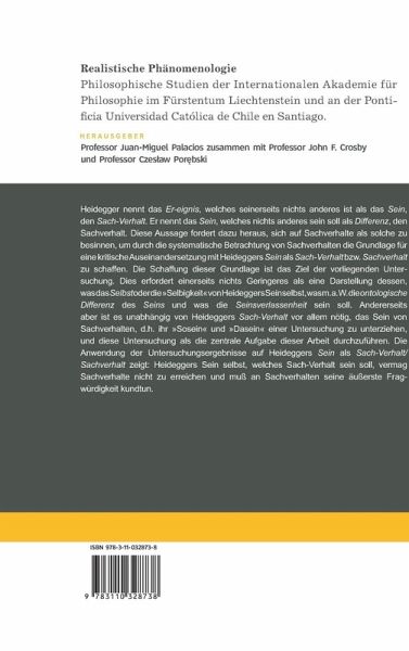 Heidegger nennt das Er-eignis, welches seinerseits nichts anderes ist als das Sein, den Sach-Verhalt. Er nennt das Sein, welches nichts anderes sein soll als Differenz, den Sachverhalt. Diese Aussage fordert dazu heraus, sich auf Sachverhalte als solche zu besinnen, um durch die systematische Betrachtung von Sachverhalten die Grundlage für eine kritische Auseinandersetzung mit Heideggers Sein als Sach-Verhalt bzw. Sachverhalt zu schaffen. Die Schaffung dieser Grundlage ist das Ziel der vorliegenden Untersuchung. Dies erfordert einerseits nichts Geringeres als eine Darstellung dessen, was das Selbst oder die »Selbigkeit« von Heideggers Sein selbst, was m.a.W. die ontologische Differenz des Seins und was die Seinsverlassenheit sein soll. Andererseits aber ist es unabhängig von Heideggers Sach-Verhalt vor allem nötig, das Sein von Sachverhalten, d.h. ihr »Sosein« und »Dasein« einer Untersuchung zu unterziehen, und diese Untersuchung als die zentrale Aufgabe dieser Arbeit durchzuführen. Die Anwendung der Untersuchungsergebnisse auf Heideggers Sein als Sach- Verhalt/Sachverhalt zeigt: Heideggers Sein selbst, welches Sach-Verhalt sein soll, vermag Sachverhalte nicht zu erreichen und muß an Sachverhalten seine äußerste Fragwürdigkeit kundtun.