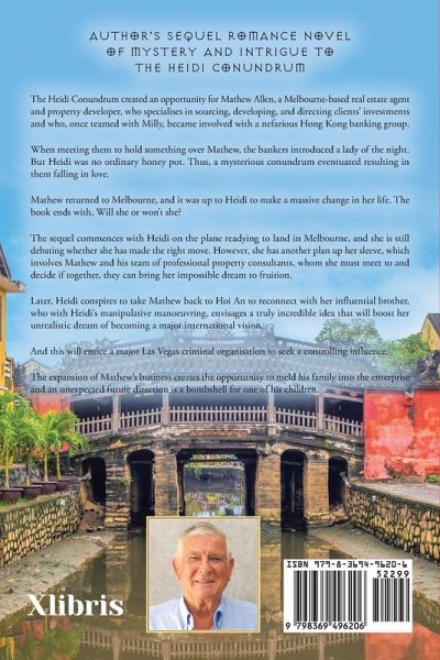 AUTHOR'S SEQUEL ROMANCE NOVEL OF MYSTERY AND INTRIGUE TO THE HEIDI CONUNDRUM The Heidi Conundrum created an opportunity for Mathew Allen, a Melbourne-based real estate agent and property developer, who specialises in sourcing, developing, and directing clients' investments and who, once teamed with Milly, became involved with a nefarious Hong Kong banking group. When meeting them to hold something over Mathew, the bankers introduced a lady of the night. But Heidi was no ordinary honey pot. Thus, a mysterious conundrum eventuated resulting in them falling in love. Mathew returned to Melbourne, and it was up to Heidi to make a massive change in her life. The book ends with, Will she or won't she? The sequel commences with Heidi on the plane readying to land in Melbourne, and she is still debating whether she has made the right move. However, she has another plan up her sleeve, which involves Mathew and his team of professional property consultants, whom she must meet to and decide if together, they can bring her impossible dream to fruition. Later, Heidi conspires to take Mathew back to Hoi An to reconnect with her influential brother, who with Heidi's manipulative manoeuvring, envisages a truly incredible idea that will boost her unrealistic dream of becoming a major international vision. And this will entice a major Las Vegas criminal organisation to seek a controlling influence. The expansion of Mathew's business creates the opportunity to meld his family into the enterprise and an unexpected future direction is a bombshell for one of his children.