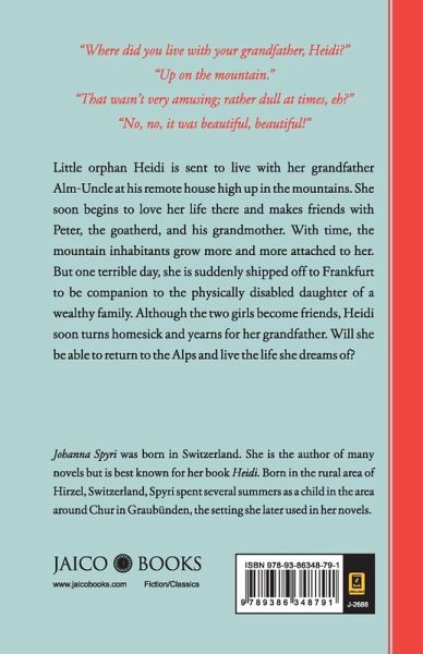 "Where did you live with your grandfather, Heidi?" "Up on the mountain." "That wasn't very amusing; rather dull at times, eh?" "No, no, it was beautiful, beautiful!" Little orphan Heidi is sent to live with her grandfather Alm-Uncle at his remote house high up in the mountains. She soon begins to love her life there and makes friends with Peter, the goatherd, and his grandmother. With time, the mountain inhabitants grow more and more attached to her. But one terrible day, she is suddenly shipped off to Frankfurt to be companion to the physically disabled daughter of a wealthy family. Although the two girls become friends, Heidi soon turns homesick and yearns for her grandfather. Will she be able to return to the Alps and live the life she dreams of? Johanna Spyri was born in Switzerland. She is the author of many novels but is best known for her book Heidi. Born in the rural area of Hirzel, Switzerland, Spyri spent several summers as a child in the area around Chur in Graubünden, the setting she later used in her novels.
