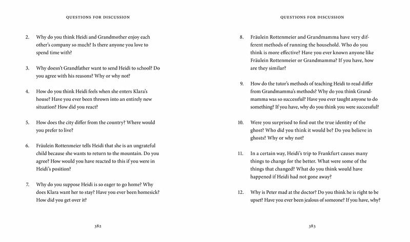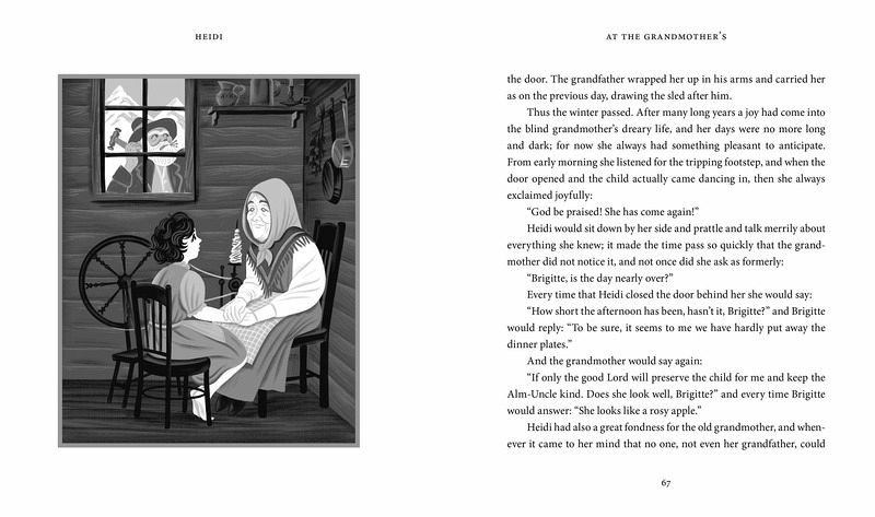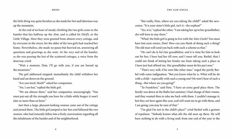 Johanna Spyri (1827–1901) was born Johanna Louise Heusser in Hirzel, Switzerland. In 1852, she moved to Zurich, where she began to write stories about life in the country. Although she wrote more than fifty stories before passing away, Johanna Spyri is best known for Heidi, the story of an orphan who goes to live with her grandfather on the mountain.