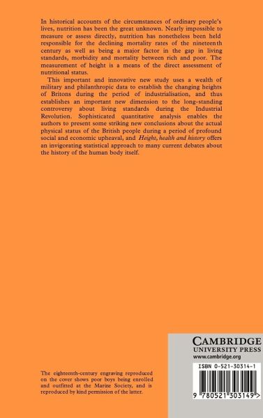 In historical accounts of the circumstances of ordinary people's lives, nutrition has been the great unknown. Nearly impossible to measure or assess directly, it has nonetheless been held responsible for the declining mortality rates of the nineteenth century as well as being a major factor in the gap in living standards, morbidity and mortality between rich and poor. The measurement of height is a means of the direct assessment of nutritional status. This important and innovative new study uses a wealth of military and philanthropic data to establish the changing heights of Britons during the period of industrialisation, and thus establishes an important new dimension to the long-standing controversy about living standards during the Industrial Revolution. Sophisticated quantitative analysis enables the authors to present some striking new conclusions about the actual physical status of the British people during a period of profound social and economic upheaval, and Height, Health and History will provide an invigorating statistical edge to many current debates about the history of the human body itself.