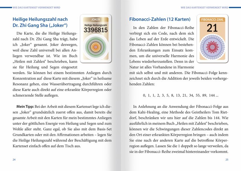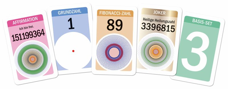 "Die Zahl ist das Wesen aller Dinge." Pythagoras (570 bis 510 v. Chr.)Heilzahlenkarten helfen, unseren eigenen Weg zu gehen, unterstützen uns in schwierigen Situationen und tragen dazu bei, wichtige Lebensfragen zu klären. Auf Basis der Schwingungsmedizin aktivieren sie körpereigene Selbstheilungsprozesse, indem sie uns genau die Informationen übermitteln, die wir für eine energetische Balancierung gerade brauchen. Die Karten dieses Sets enthalten zudem jeweils die Abbildung eines zugehörigen, zahlenbasierten Heilmandalas (außer Basis-Set): Jede Heilzahl - übersetzt in Farbfrequenzen und Mandalaformen - bildet die Basis für die Erstellung der energetischen Signatur. Ein Heilmandala erleichtert die Resonanz, das Einschwingen auf die Zahlencodes, denn es eröffnet Kommunikationskanäle direkt zu unserem Unterbewusstsein. Das Basis-Set Grundzahlen ermöglicht das Nachlegen aller Zahlencodes (z.B. Grabovoi) sowie das intuitive Ziehen persönlicher Heil- oder Tageszahlen.Das Set enthält 180 Karten:-Affirmationen mit Heilzahlen (68 Karten)-Grundzahlen 1 bis 9 (9 Karten)-Fibonacci-Zahlen (12 Karten)-Heilige Heilungszahl nach Dr. Zhi Gang Sha ("Joker")-Basis-Set Grundzahlen (90 Karten)Das 32-seitige Booklet beinhaltet eine ausführliche Anleitung.