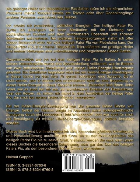 Der heilige Pater Pio - ein Mann, der bereits als Schuljunge den Entschluss fasste Kapuzinermönch zu werden, der bereits zu Lebzeiten als Heiliger galt und dessen Heimatort jedes Jahr zur Pilgerstätte für unzählige Gläubige wird. Diesem Menschen widmet Helmut Geppert sein Buch "Heiler Gottes, heiliger Pater Pio. Meine Erlebnisse und Empfindungen als geistiger Heiler" (BoD Norderstedt). Er nimmt den Leser nicht nur auf eine lebendige Reise durch das Leben des Pater Pio, sondern gewährt auch Einblicke in seine ganz persönlichen Eindrücke und Erlebnisse während seiner Wallfahrt nach San Giovanni…mehr