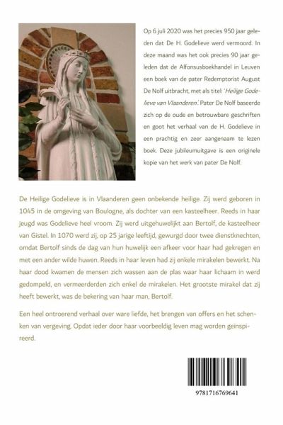 De Heilige Godelieve is in Vlaanderen geen onbekende heilige. Zij werd geboren in 1045 in de omgeving van Boulogne, als dochter van een kasteelheer. Reeds in haar jeugd was Godelieve heel vroom. Zij werd uitgehuwelijkt aan Bertolf, de kasteelheer van Gistel. In 1070 werd zij, op 25 jarige leeftijd, gewurgd door twee dienstknechten, omdat Bertolf sinds de dag van hun huwelijk een afkeer voor haar had gekregen en met een ander wilde huwen. Reeds in haar leven had zij enkele mirakelen bewerkt. Na haar dood kwamen de mensen zich wassen aan de plas waar haar lichaam in werd gedompeld, en vermeerderden zich enkel de mi-rakelen. Het grootste mirakel dat zij heeft bewerkt, was de bekering van haar man, Bertolf. Een heel ontroerend verhaal over ware liefde, het brengen van offers en het schenken van vergeving. Opdat ieder door haar voorbeeldig leven mag worden geïnspireerd. Op 6 juli 2020 was het precies 950 jaar geleden dat De H. Godelieve werd vermoord. In deze maand was het ook precies 90 jaar geleden dat de Alfonsusboekhandel in Leuven een boek van de pater Redemptorist August De Nolf uitbracht, met als titel: 'Heilige Godelieve van Vlaanderen'. Pater De Nolf baseerde zich op de oude en betrouwbare geschriften en goot het verhaal van de H. Godelieve in een prachtig en zeer aangenaam te lezen boek. Deze jubileumuitgave is een originele kopie van het werk van pater De Nolf.
