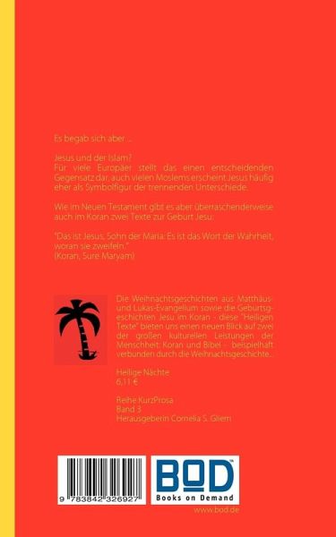 Heilige Nächte. Es begab sich aber ...Die Weihnachtsgeschichte - vermutlich eine der weltweit bekanntesten Geschichten überhaupt - bietet die Möglichkeit, bei allen bedeutsamen Unterschieden die Gemeinsamkeiten von Christentum und Islam zu begreifen.Jesus und der Islam? Für viele christlich-geprägte Europäer stellt das einen entscheidenden Gegensatz dar, und auch vielen Moslems erscheint Jesus häufig eher als Symbolfigur der trennenden Unterschiede. Wie im Neuen Testament gibt es aber überraschenderweise auch im Koran zwei Texte zur Geburt Jesu:"Und gedenke im Buch Marias, als sie sich von ihren Angehörigen an einen östlichen Ort zurückzog. (...)Das ist Jesus, Sohn der Maria: Es ist das Wort der Wahrheit, woran sie zweifeln."(Koran, Sure Maryam)"Als Jesus zur Zeit des Königs Herodes in Bethlehem in Judäa geboren worden war, kamen Sterndeuter aus dem Osten nach Jerusalem."(Bibel, Matthäus-Evangelium, 2)Diese "Heiligen Texte" können die Verbindungen zur Schwester-Religion bewusster machen und darüber hinaus interessierten Lesern einen neuen Blick auf zwei der großen kulturellen Leistungen der Menschheit bieten: Koran und Bibel - beispielhaft verbunden durch die Weihnachtsgeschichte...Die Weihnachtsgeschichten aus Matthäus- und Lukas-Evangelium die Geburtsgeschichten Jesu in Sure 3 und 19 - die gemeinsame Geschichte muss man kennen! - Jesu / Isa Ben Maryams Geburt in Bibel und Koran Reihe KurzProsa, Band 3Cornelia Gliem (Hg.)