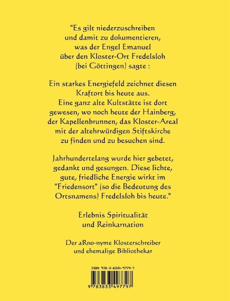 Es gibt Orte, die besondere Energien ausstrahlen und eine Anziehungskraft entfalten. Fredelsloh (bei Göttingen) ist bis auf den heutigen Tag solch ein Kraftort. Arno Schelle (Geschichts- und Religionslehrer aus Fredelsloh sowie Autor von "Mönchsherz") befragt den Engel Emanuel mit Hilfe des renommierten Mediums Christiane Zimmer, was es mit dem Ort und seiner langen Kult- und Klostertradition auf sich hat. Emanuel erläutert es so:"In früheren Zeiten hatten die Menschen noch stärker ein Bewußtsein von Orten, wo Energiefelder oder Energieknoten waren, also, wo sich Energiebänder getroffen haben, einen Knoten geknüpft haben. Ihr habt doch wie ein Gitternetz über diese eure Erde. Siehe: Und Gitter bedeutet ja immer, dass sich Längs- und Querlinien irgendwo treffen. Und das bedeutet, dass das ganz besonders starke Energiefelder sind. Und die frühen Menschen, die also noch Gottheiten anbeteten und die Natur anbeteten, haben sich auf diese Energiefelder verstanden. Und haben auf diesen Energiefeldern ihre Haine gebaut oder ihre Kultstätten. Und die späteren Christen haben häufig diese Kultstätten übernommen und ihre Kirchen darauf gebaut. Haben also damit auch geglaubt, das Heidentum schneller verabschieden zu können. Ist es so deutlich ?Arno: Ja. War das in Fredelsloh so ?Emanuel: Eben. Eben. Da zeigt sich mir, da ist eine ganz alte Kultstätte gewesen.Arno: Kannst du mir darüber mehr sagen ? Das würde mich sehr interessieren."Die Spurensuche einer alten Seele nach ihren Wurzeln geht weiter ... und führt den Bücher-Begeisterten direkt in die alte Bibliothek des ehemaligen Klosters Fredelsloh.