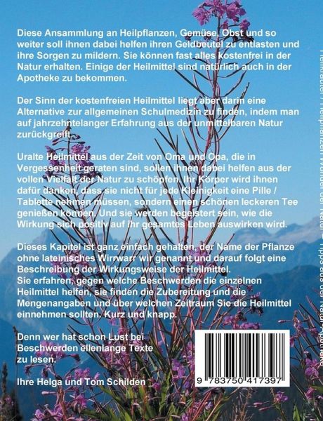 Diese Ansammlung an Heilpflanzen, Heilkräutern, Gemüse oder Obst soll ihnen dabei helfen ihren Geldbeutel zu entlasten und ihre Sorgen zu mildern. Sie können fast alles kostenfrei in der Natur erhalten. Einige der Heilmittel sind natürlich auch in der Apotheke zu bekommen.Der Sinn der kostenfreien Heilmittel liegt aber darin eine Alternative zur allgemeinen Schulmedizin zu finden, indem man auf jahrzehntelanger Erfahrung aus der unmittelbaren Natur zurückgreift. Es werden die Gesundheitshelfer aus der Natur näher vorgestellt.Uralte Heilmittel aus der Zeit von Oma und Opa, die in Vergessenheit geraten sind, sollen ihnen dabei helfen aus der vollen Vielfalt der Natur zu schöpfen. Ihr Körper wird ihnen dafür danken, dass sie nicht für jede Kleinigkeit eine Pille / Tablette nehmen müssen, sondern einen schönen leckeren Tee genießen können. Und sie werden begeistert sein, wie die Wirkung sich positiv auf ihr gesamtes Leben auswirken wird.Dieses Kapitel ist ganz einfach gehalten, der Name der Pflanze ohne lateinisches Wirrwarr wir genannt und darauf folgt eine Beschreibung der Wirkungsweise der Heilmittel.Sie erfahren, gegen welche Beschwerden die einzelnen Heilmittel helfen, sie finden die Zubereitung und die Mengenangaben und über welchen Zeitraum Sie die Heilmittel einnehmen sollten. Kurz und knapp.Denn wer hat schon Lust bei Beschwerden ellenlange Texte zu lesen.