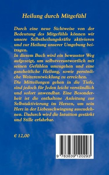Durch eine neue Sichtweise von der Bedeutung des Mitgefühls können wir unsere Selbstheilungskräfte aktivieren und zur Heilung unserer Umgebung beitragen. In diesem Buch wird ein bewusster Weg aufgezeigt, um selbstverantwortlich mit seinen Gefühlen umzugehen und eine ganzheitliche Heilung, sowie persönliche Weiterentwicklung zu erreichen. Die Mitteilungen gehen in die Tiefe, sind jedoch für Jeden leicht verständlich und sofort anwendbar. Eine Besonderheit ist die enthaltene Anleitung zur Selbstaktivierung im Herzen, um sein Herz in der Liebesschwingung auszudehnen. Dadurch wird die Intuition gestärkt und Stille erfahrbar.