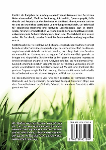 Endlich ein Ratgeber mit umfangreichen Erkenntnissen aus den Bereichen Naturwissenschaft, Medizin, Ernährung, Spiritualität, Quantenphysik, Feldtheorie und Prophylaxe, der den Leser an der Hand nimmt, um ein konkretes und anschauliches Verständnis von Heilung zu entwickeln. Der Schlüssel für körperliche Harmonie und kraftvolle Lebensenergie liegt im praktischen, naturwissenschaftlichen Verständnis und der eigenen Bewusstseinsentwicklung und Selbstermächtigung - denn jeder Mensch heilt sich immer selbst. Ein Sachbuch, das den Schrei der Seele nach Gesundung begreifbar macht.Spätestens bei der Perspektive auf die kosmisch natürlichen Rhythmen springt beim Leser der Funke über. Inneren Mangel durch Elektronenfluss positiv auszugleichen wirkt vielleicht zunächst paradox, doch liegt darin das Geheimnis menschlicher Existenz, um das eigene Kraftfeld in ein Gleichgewicht zu bringen und körperliche Disharmonien zu korrigieren. Besonders interessant sind die modernen Diagnose- und Analysemethoden, die Komplementärheilung mit schulmedizinischen Erkenntnissen in der Therapie verbinden. Dieser Ansatz gewährleistet eine holistische Sicht auf Mensch und Krankheit. Die probate Gegenstrategie für Elektrosmog, Radioaktivität sowie individuelle Unzufriedenheit und ein sicherer Weg hin zu Glück und Harmonie.Ein beeindruckendes Werk von führenden Experten der komplementären Heilkunde und Energiemedizin, Dr. Manfred Doepp & Alexander Glogg, aus dem Gesundheitszentrum Bichwil / Schweiz, in dem diese Grundsätze aktiv gelebt werden.Die Medizin wäre gut beraten, wenn sie sich von der linearen Dreidimensionalität einer Newton'schen Physik lösen und sich stattdessen der Physik des 21. Jahrhunderts zuzuwenden würde. Andernfalls wird sie keine Naturwissenschaft mehr sein.