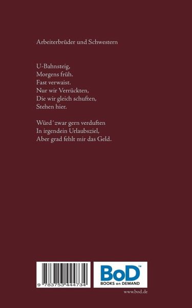 Arbeiterbrüder und SchwesternU-Bahnsteig,Morgens früh.Fast verwaist.Nur wir Verrückten,Die wir gleich schuften,Stehen hier.Würd´zwar gern verduftenIn irgendein Urlaubsziel,Aber grad fehlt mir das Geld.